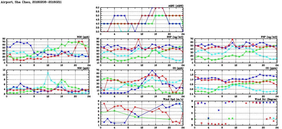 | Air Quality Data Time Series in Airport, Sha Chau (2018/02/11) | ( Line colors: Day -3 Day -2 Day -1 Current day ) | 2D Map Current AQHI |