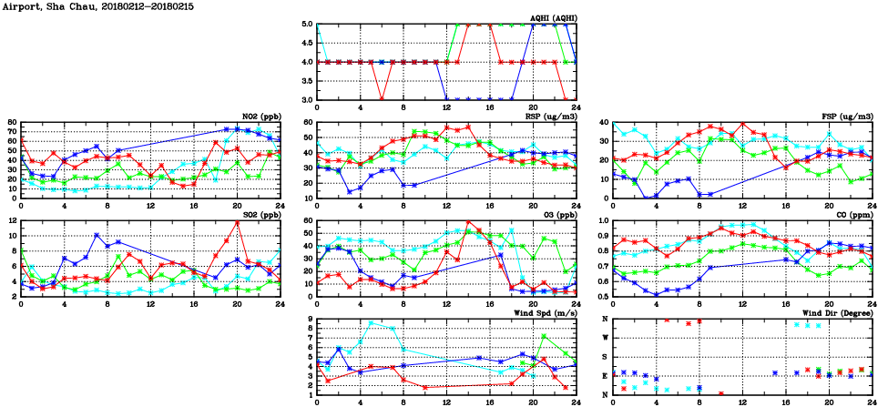 | Air Quality Data Time Series in Airport, Sha Chau (2018/02/15) | ( Line colors: Day -3 Day -2 Day -1 Current day ) | 2D Map Current AQHI |