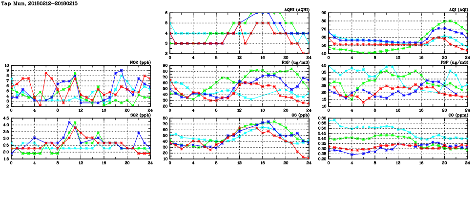 | Air Quality Data Time Series in Tap Mun (2018/02/15) | ( Line colors: Day -3 Day -2 Day -1 Current day ) | 2D Map Current AQHI |