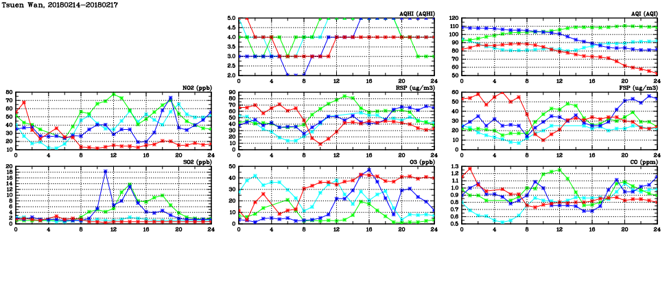| Air Quality Data Time Series in Tsuen Wan (2018/02/17) | ( Line colors: Day -3 Day -2 Day -1 Current day ) | 2D Map Current AQHI |