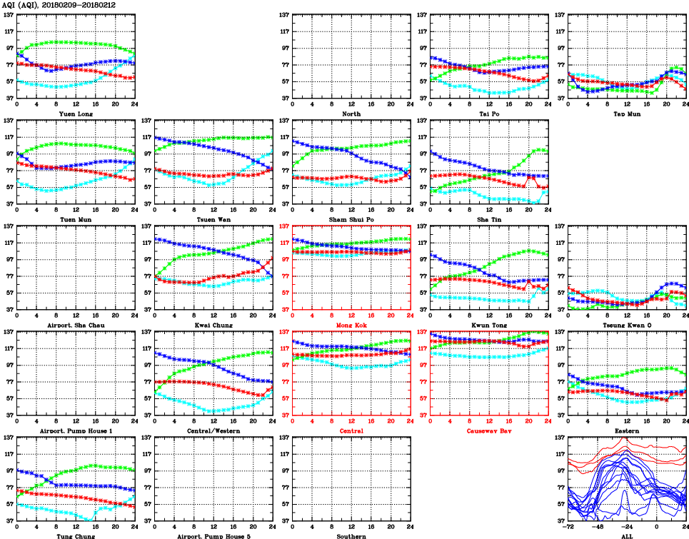 | Air Quality Data Time Series for AQI (2018/02/12) | ( Line colors: Day -3 Day -2 Day -1 Current day ) | 2D Map Current AQHI |