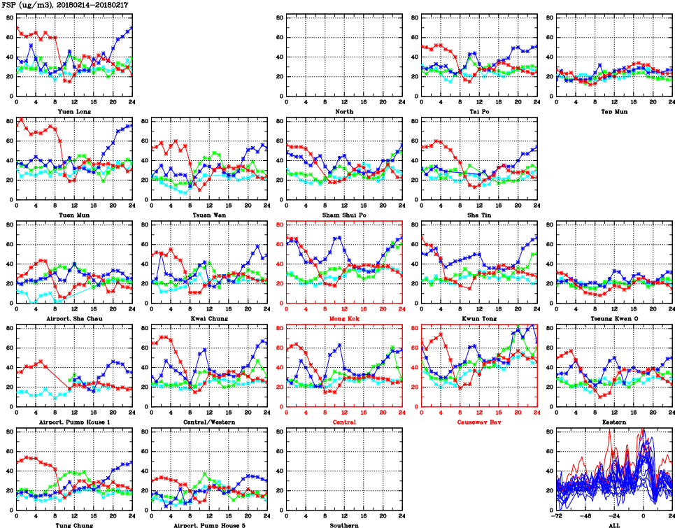 | Air Quality Data Time Series for FSP (2018/02/17) | ( Line colors: Day -3 Day -2 Day -1 Current day ) | 2D Map Current AQHI |