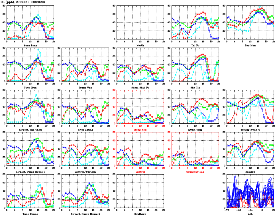 | Air Quality Data Time Series for O3 (2018/02/13) | ( Line colors: Day -3 Day -2 Day -1 Current day ) | 2D Map Current AQHI |