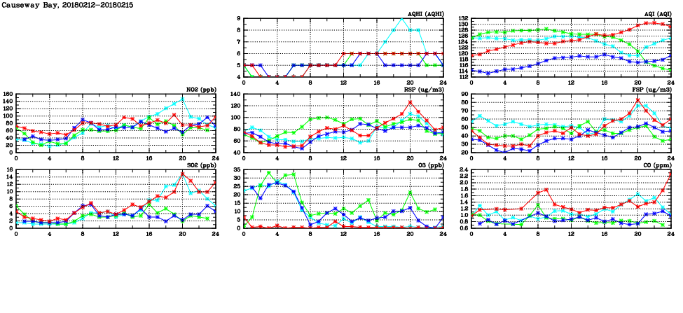| Air Quality Data Time Series in Causeway Bay (2018/02/15) | ( Line colors: Day -3 Day -2 Day -1 Current day ) | 2D Map Current AQHI |
