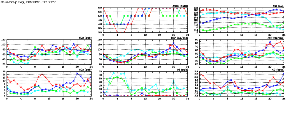| Air Quality Data Time Series in Causeway Bay (2018/02/16) | ( Line colors: Day -3 Day -2 Day -1 Current day ) | 2D Map Current AQHI |