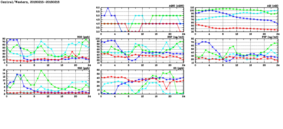 | Air Quality Data Time Series in Central/Western (2018/02/18) | ( Line colors: Day -3 Day -2 Day -1 Current day ) | 2D Map Current AQHI |