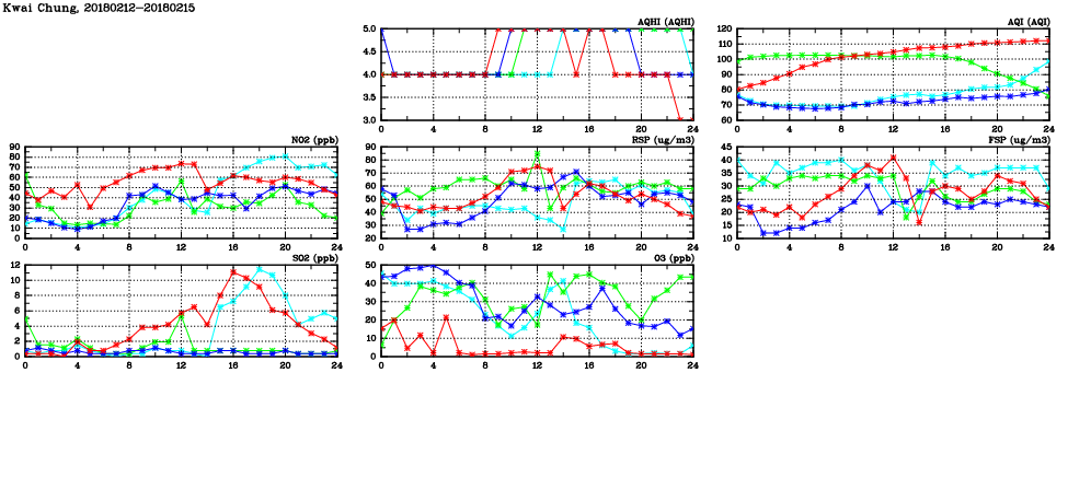 | Air Quality Data Time Series in Kwai Chung (2018/02/15) | ( Line colors: Day -3 Day -2 Day -1 Current day ) | 2D Map Current AQHI |