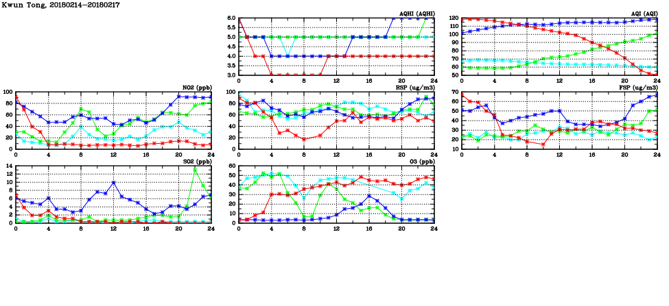 | Air Quality Data Time Series in Kwun Tong (2018/02/17) | ( Line colors: Day -3 Day -2 Day -1 Current day ) | 2D Map Current AQHI |