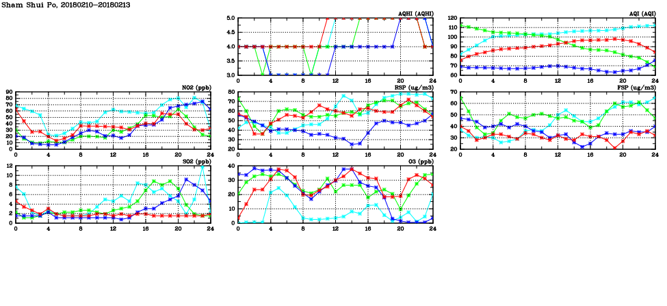 | Air Quality Data Time Series in Sham Shui Po (2018/02/13) | ( Line colors: Day -3 Day -2 Day -1 Current day ) | 2D Map Current AQHI |