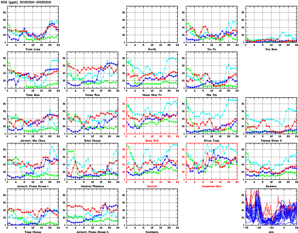 | Air Quality Data Time Series for NO2 (2018/02/19) | ( Line colors: Day -3 Day -2 Day -1 Current day ) | 2D Map Current AQHI |