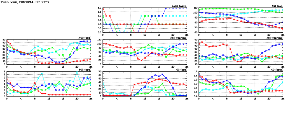 | Air Quality Data Time Series in Tuen Mun (2018/02/17) | ( Line colors: Day -3 Day -2 Day -1 Current day ) | 2D Map Current AQHI |