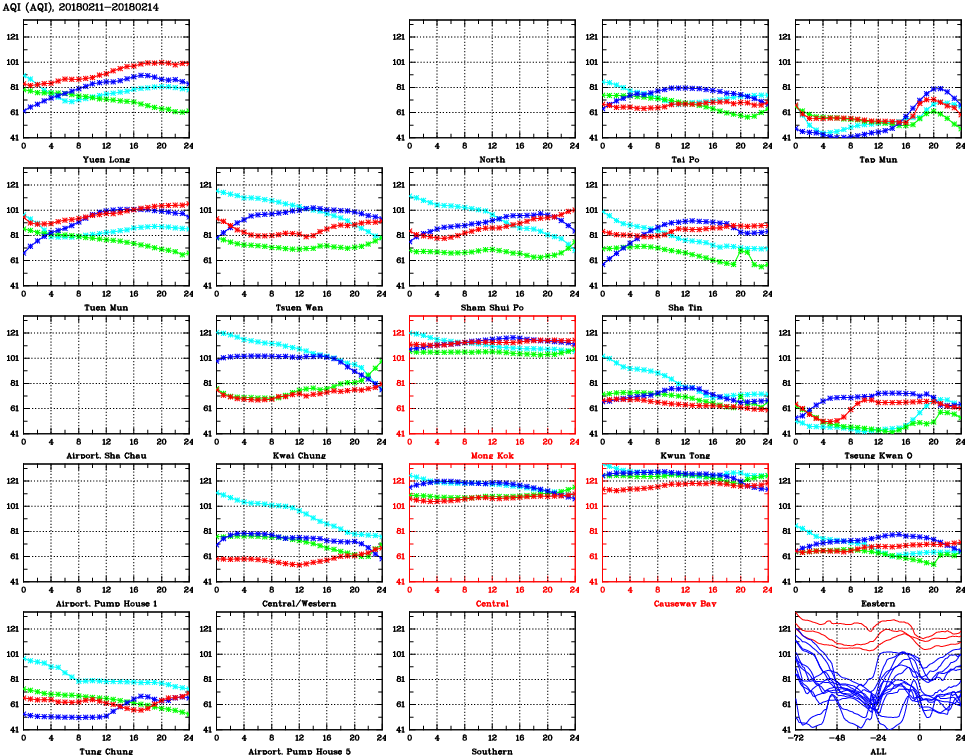 | Air Quality Data Time Series for AQI (2018/02/14) | ( Line colors: Day -3 Day -2 Day -1 Current day ) | 2D Map Current AQHI |