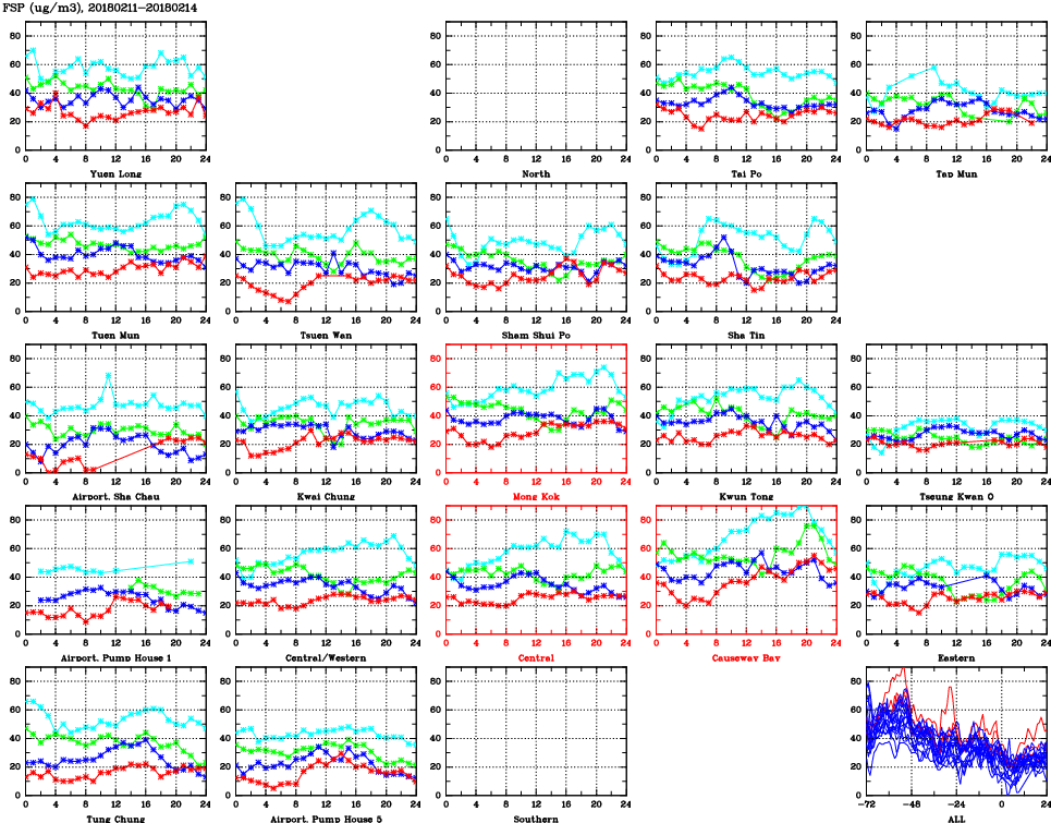 | Air Quality Data Time Series for FSP (2018/02/14) | ( Line colors: Day -3 Day -2 Day -1 Current day ) | 2D Map Current AQHI |