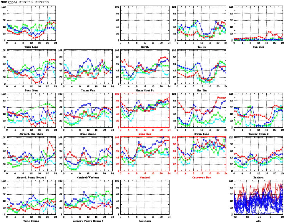 | Air Quality Data Time Series for NO2 (2018/02/16) | ( Line colors: Day -3 Day -2 Day -1 Current day ) | 2D Map Current AQHI |