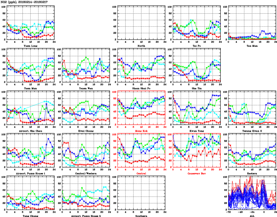 | Air Quality Data Time Series for NO2 (2018/02/17) | ( Line colors: Day -3 Day -2 Day -1 Current day ) | 2D Map Current AQHI |