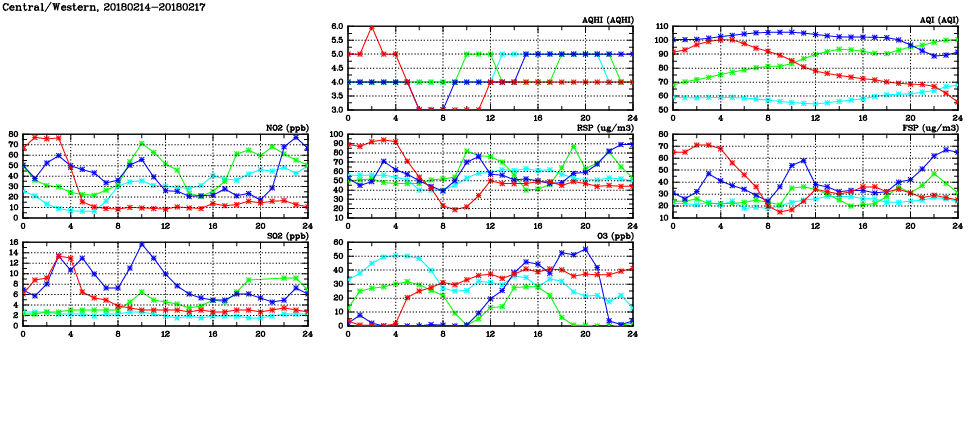 | Air Quality Data Time Series in Central/Western (2018/02/17) | ( Line colors: Day -3 Day -2 Day -1 Current day ) | 2D Map Current AQHI |