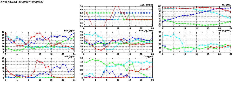 | Air Quality Data Time Series in Kwai Chung (2018/02/20) | ( Line colors: Day -3 Day -2 Day -1 Current day ) | 2D Map Current AQHI |