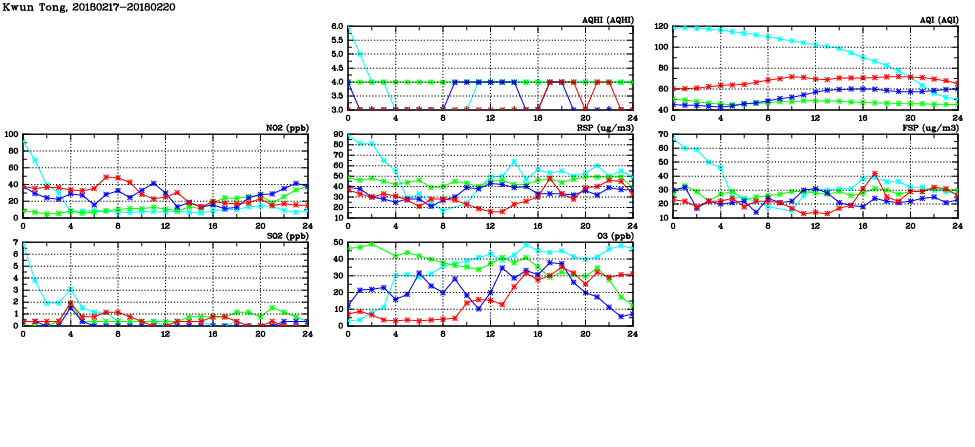 | Air Quality Data Time Series in Kwun Tong (2018/02/20) | ( Line colors: Day -3 Day -2 Day -1 Current day ) | 2D Map Current AQHI |