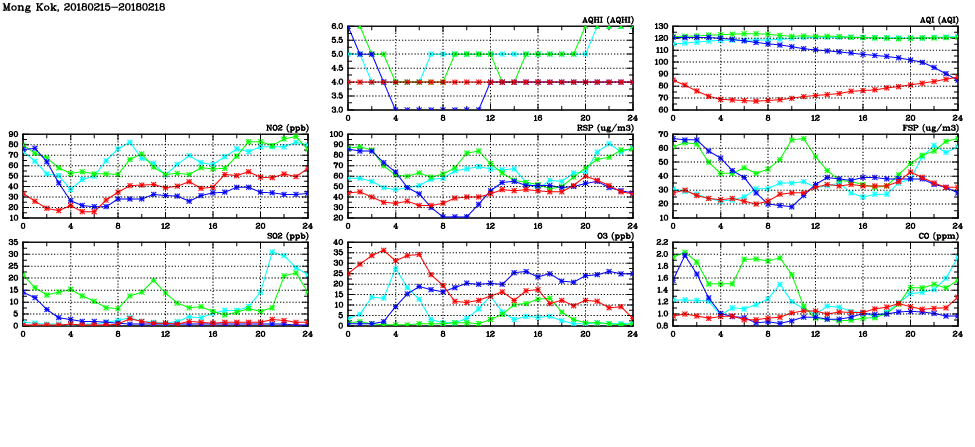 | Air Quality Data Time Series in Mong Kok (2018/02/18) | ( Line colors: Day -3 Day -2 Day -1 Current day ) | 2D Map Current AQHI |