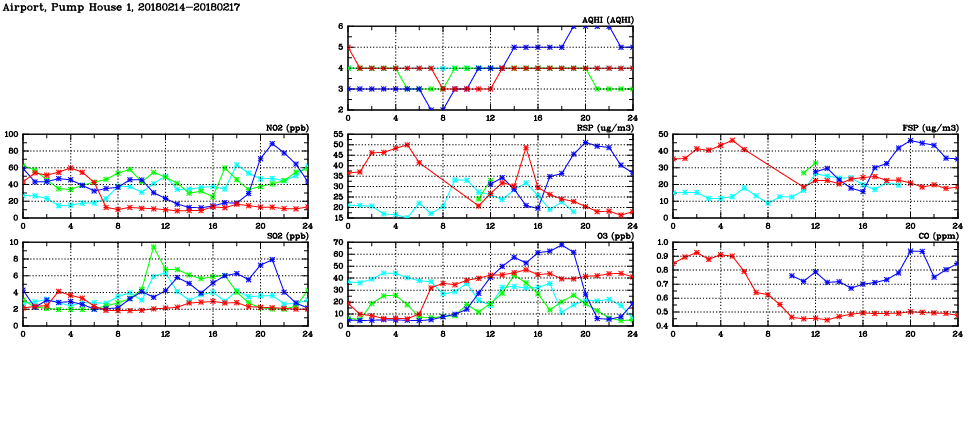 | Air Quality Data Time Series in Airport, Pump House 1 (2018/02/17) | ( Line colors: Day -3 Day -2 Day -1 Current day ) | 2D Map Current AQHI |