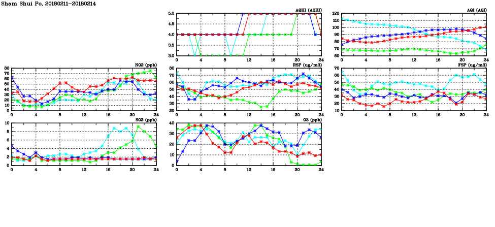 | Air Quality Data Time Series in Sham Shui Po (2018/02/14) | ( Line colors: Day -3 Day -2 Day -1 Current day ) | 2D Map Current AQHI |