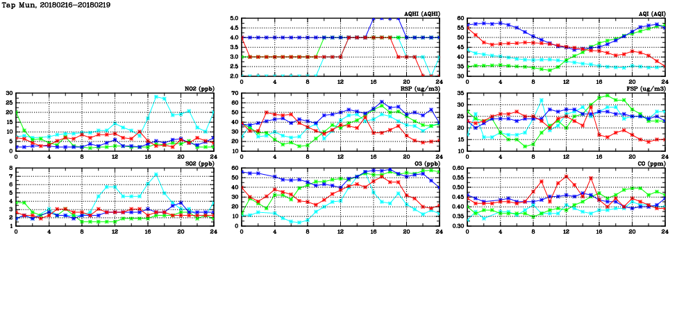 | Air Quality Data Time Series in Tap Mun (2018/02/19) | ( Line colors: Day -3 Day -2 Day -1 Current day ) | 2D Map Current AQHI |