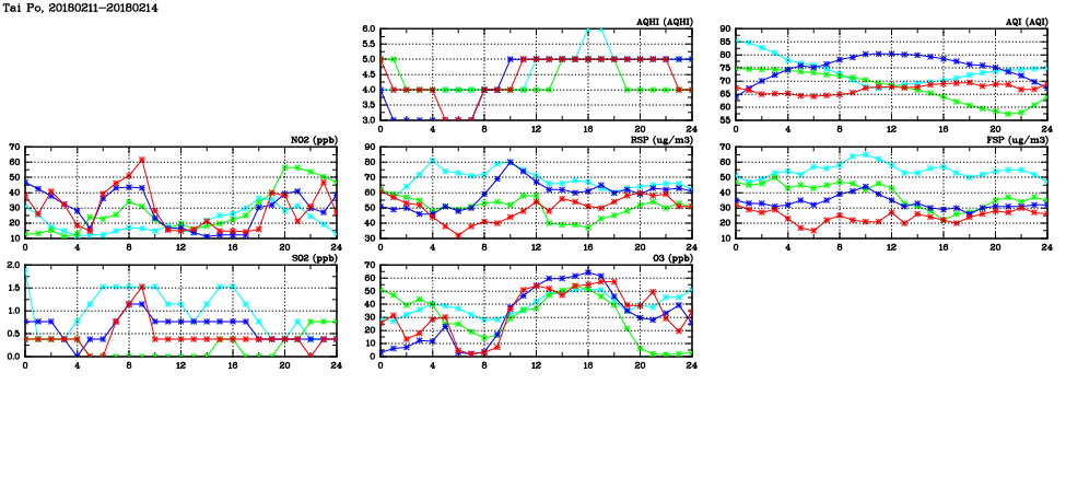 | Air Quality Data Time Series in Tai Po (2018/02/14) | ( Line colors: Day -3 Day -2 Day -1 Current day ) | 2D Map Current AQHI |