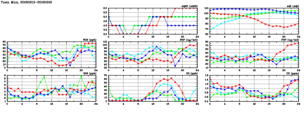 | Air Quality Data Time Series in Tuen Mun (2018/02/16) | ( Line colors: Day -3 Day -2 Day -1 Current day ) | 2D Map Current AQHI |