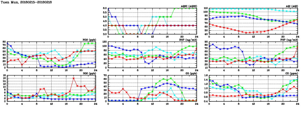 | Air Quality Data Time Series in Tuen Mun (2018/02/18) | ( Line colors: Day -3 Day -2 Day -1 Current day ) | 2D Map Current AQHI |