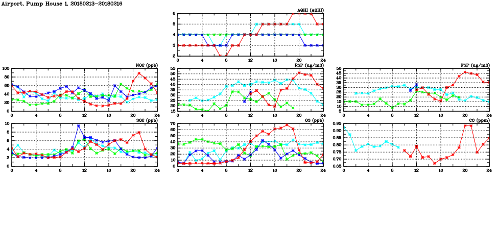 | Air Quality Data Time Series in Airport, Pump House 1 (2018/02/16) | ( Line colors: Day -3 Day -2 Day -1 Current day ) | 2D Map Current AQHI |