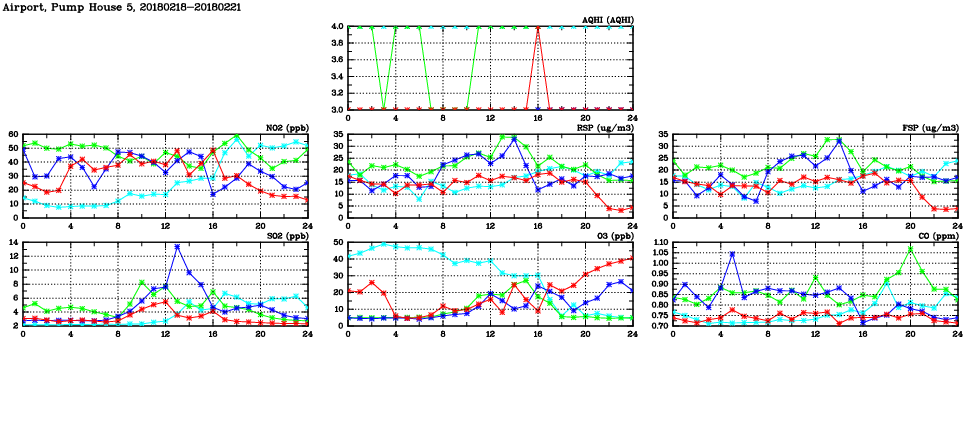 | Air Quality Data Time Series in Airport, Pump House 5 (2018/02/21) | ( Line colors: Day -3 Day -2 Day -1 Current day ) | 2D Map Current AQHI |