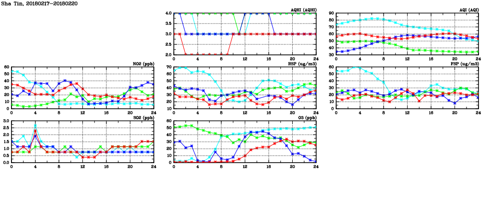 | Air Quality Data Time Series in Sha Tin (2018/02/20) | ( Line colors: Day -3 Day -2 Day -1 Current day ) | 2D Map Current AQHI |