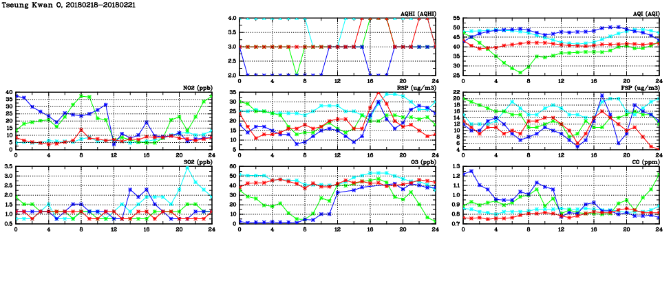 | Air Quality Data Time Series in Tseung Kwan O (2018/02/21) | ( Line colors: Day -3 Day -2 Day -1 Current day ) | 2D Map Current AQHI |
