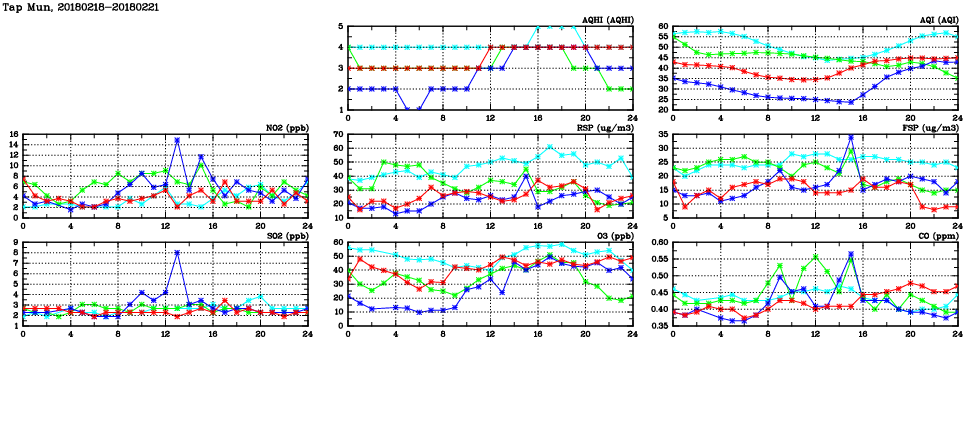 | Air Quality Data Time Series in Tap Mun (2018/02/21) | ( Line colors: Day -3 Day -2 Day -1 Current day ) | 2D Map Current AQHI |