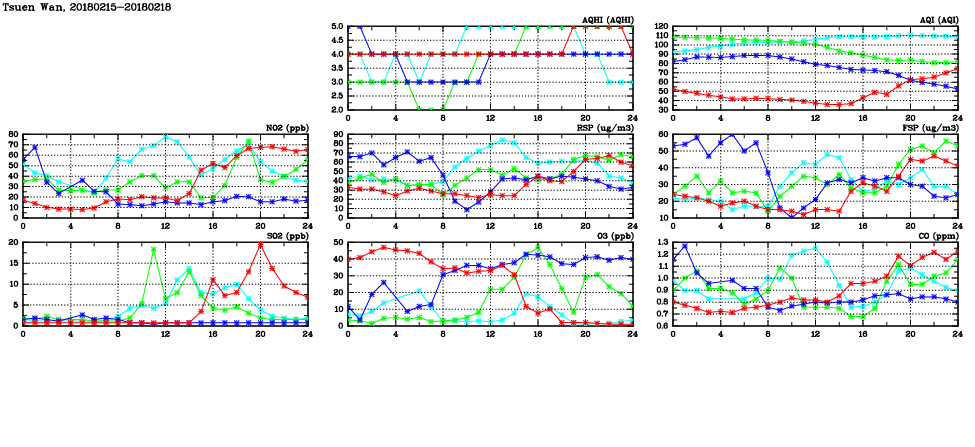 | Air Quality Data Time Series in Tsuen Wan (2018/02/18) | ( Line colors: Day -3 Day -2 Day -1 Current day ) | 2D Map Current AQHI |