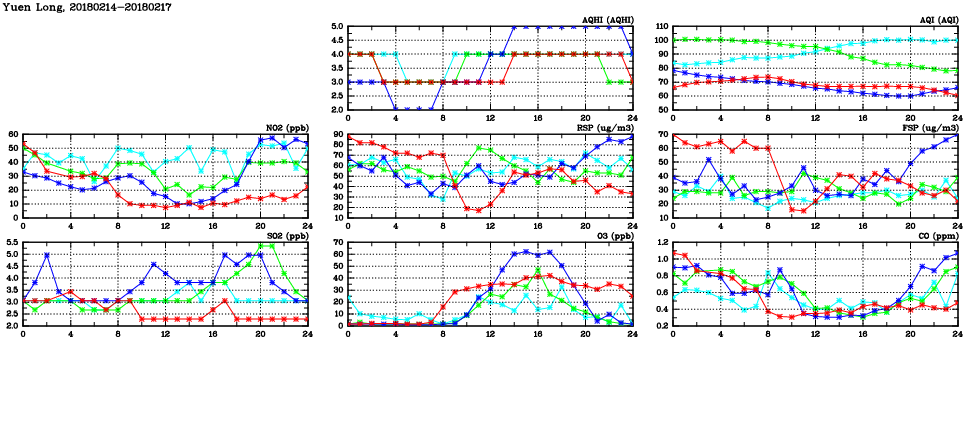 | Air Quality Data Time Series in Yuen Long (2018/02/17) | ( Line colors: Day -3 Day -2 Day -1 Current day ) | 2D Map Current AQHI |