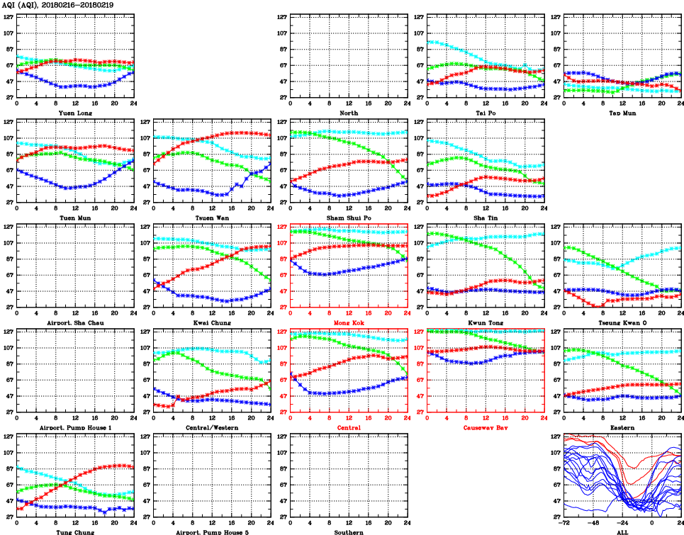 | Air Quality Data Time Series for AQI (2018/02/19) | ( Line colors: Day -3 Day -2 Day -1 Current day ) | 2D Map Current AQHI |