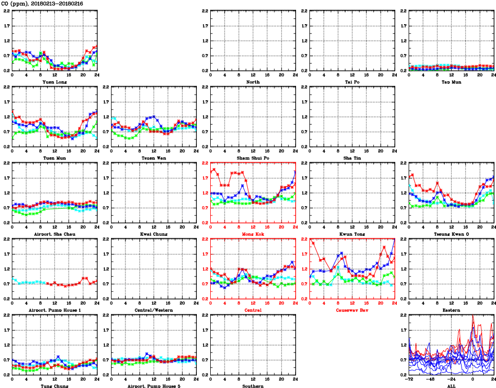 | Air Quality Data Time Series for CO (2018/02/16) | ( Line colors: Day -3 Day -2 Day -1 Current day ) | 2D Map Current AQHI |
