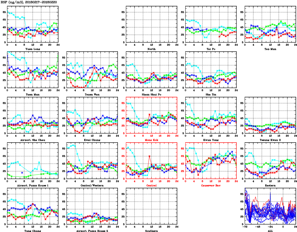 | Air Quality Data Time Series for RSP (2018/02/20) | ( Line colors: Day -3 Day -2 Day -1 Current day ) | 2D Map Current AQHI |