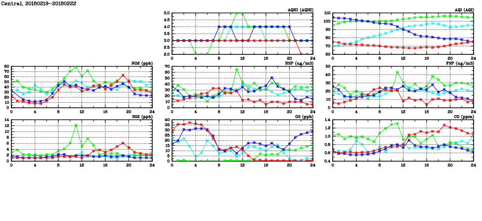 | Air Quality Data Time Series in Central (2018/02/22) | ( Line colors: Day -3 Day -2 Day -1 Current day ) | 2D Map Current AQHI |