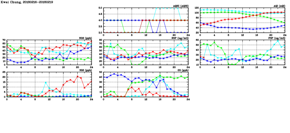 | Air Quality Data Time Series in Kwai Chung (2018/02/19) | ( Line colors: Day -3 Day -2 Day -1 Current day ) | 2D Map Current AQHI |