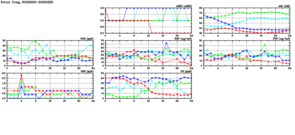 | Air Quality Data Time Series in Kwun Tong (2018/02/22) | ( Line colors: Day -3 Day -2 Day -1 Current day ) | 2D Map Current AQHI |