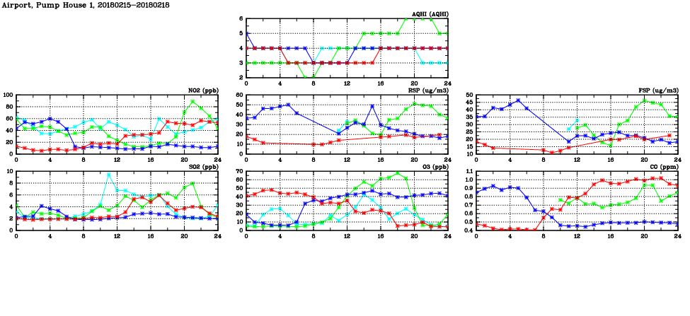 | Air Quality Data Time Series in Airport, Pump House 1 (2018/02/18) | ( Line colors: Day -3 Day -2 Day -1 Current day ) | 2D Map Current AQHI |