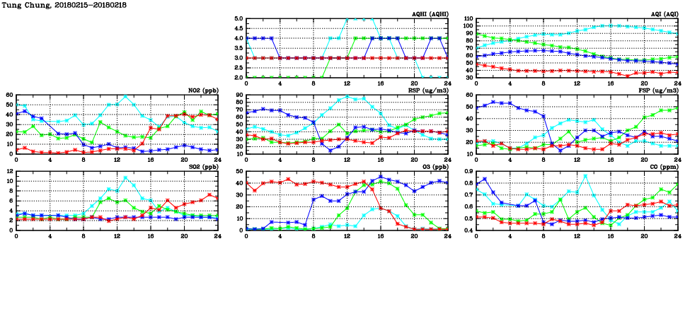 | Air Quality Data Time Series in Tung Chung (2018/02/18) | ( Line colors: Day -3 Day -2 Day -1 Current day ) | 2D Map Current AQHI |