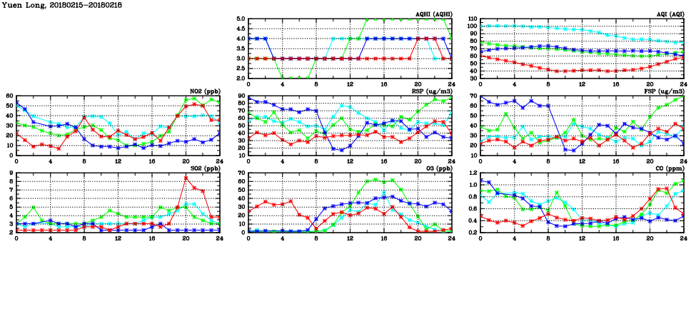 | Air Quality Data Time Series in Yuen Long (2018/02/18) | ( Line colors: Day -3 Day -2 Day -1 Current day ) | 2D Map Current AQHI |