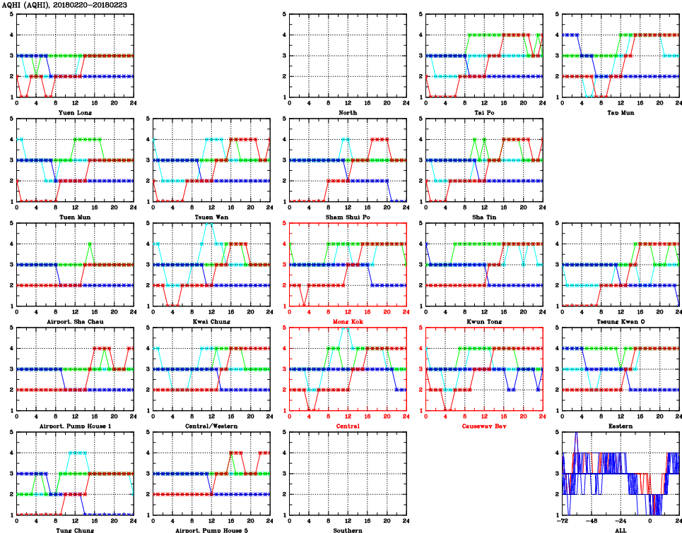 | Air Quality Data Time Series for AQHI (2018/02/23) | ( Line colors: Day -3 Day -2 Day -1 Current day ) | 2D Map Current AQHI |