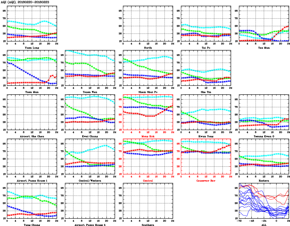 | Air Quality Data Time Series for AQI (2018/02/23) | ( Line colors: Day -3 Day -2 Day -1 Current day ) | 2D Map Current AQHI |