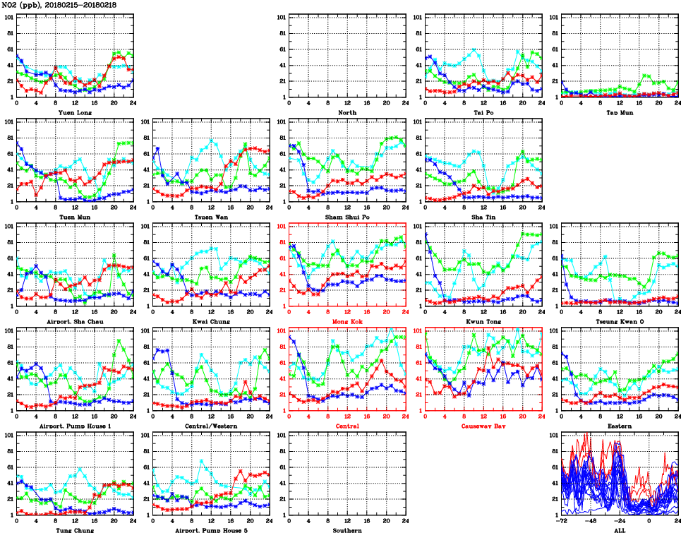 | Air Quality Data Time Series for NO2 (2018/02/18) | ( Line colors: Day -3 Day -2 Day -1 Current day ) | 2D Map Current AQHI |