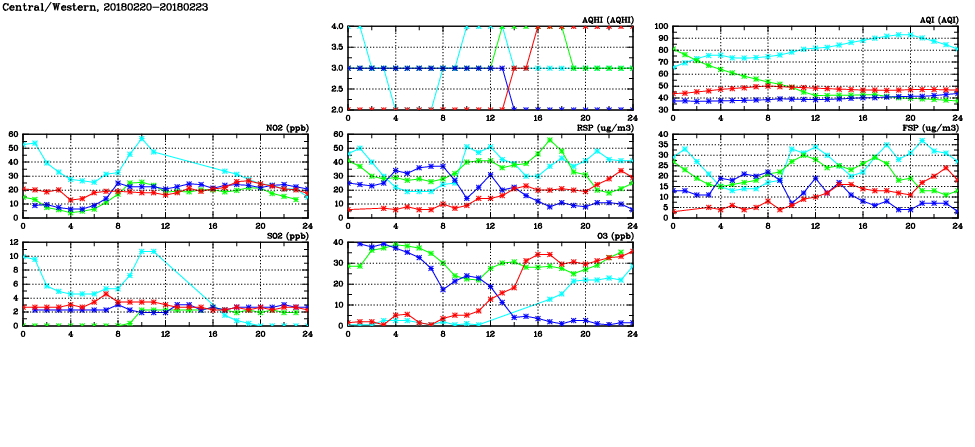 | Air Quality Data Time Series in Central/Western (2018/02/23) | ( Line colors: Day -3 Day -2 Day -1 Current day ) | 2D Map Current AQHI |