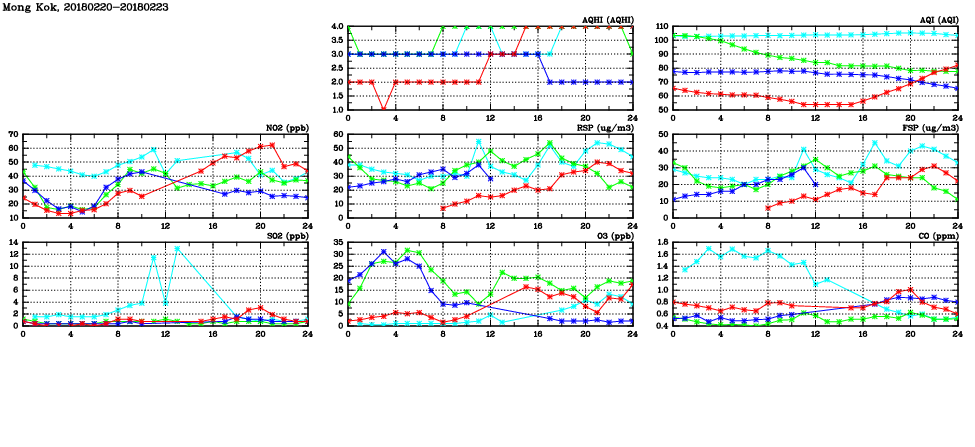 | Air Quality Data Time Series in Mong Kok (2018/02/23) | ( Line colors: Day -3 Day -2 Day -1 Current day ) | 2D Map Current AQHI |